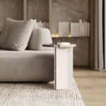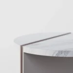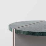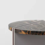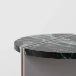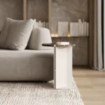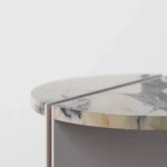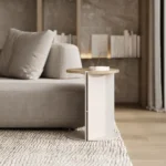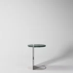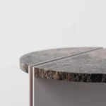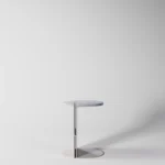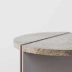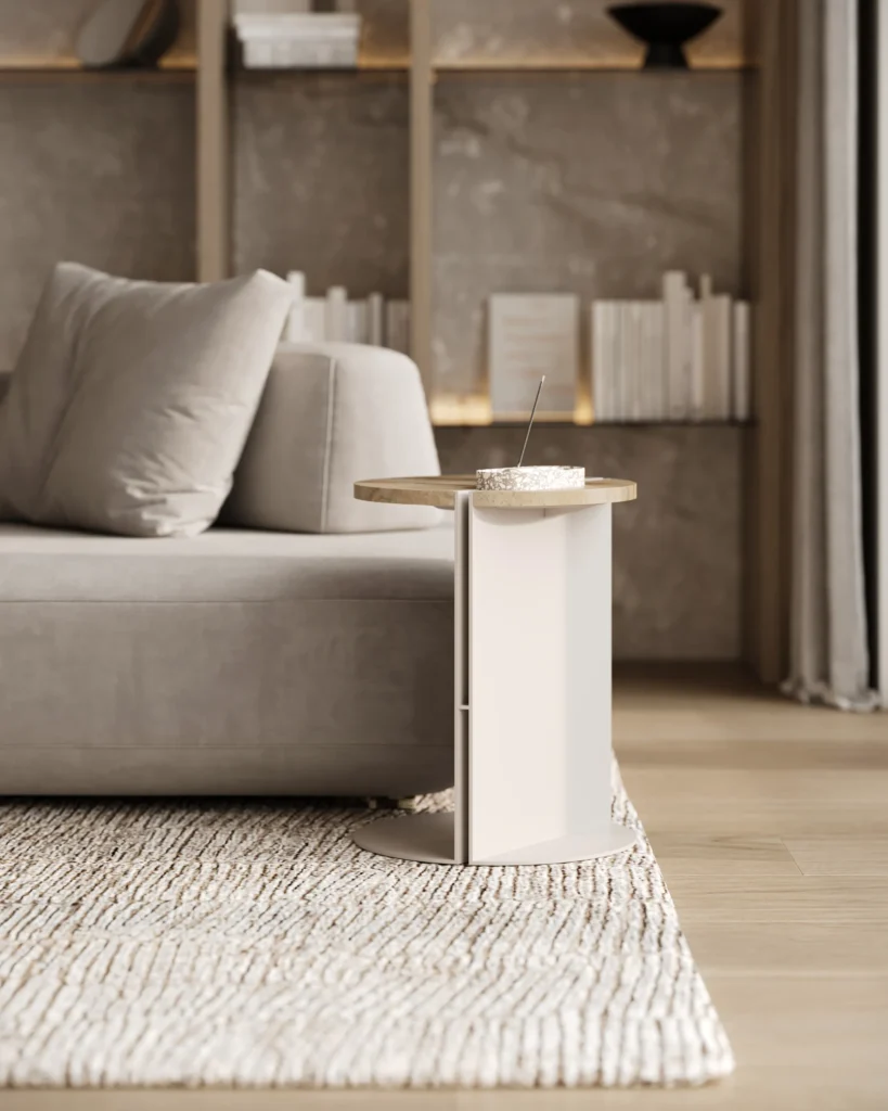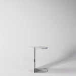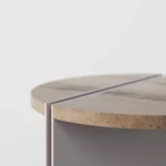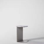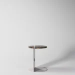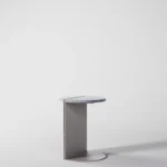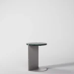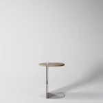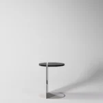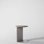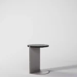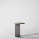 Ovaj pomoćni ili noćni stočić se odlikuje modernim i minimalističkim dizajnom, sa veoma izraženim detaljima u konstrukciji. Njegova konstrukcija je sastavljena od vertikalne ploče koja nosi debelu, kružnu ploču stola, ali ono što ga čini specifičnim su gerovane spojene i podebljane ivice. Ovaj detalj imitira masivnu strukturu, dajući stolu čvrstinu i robusnost, dok istovremeno održava minimalistički izgled. Sa sofisticiranim pristupom dizajnu, ovaj stočić postaje elegantan komad nameštaja u svakom prostoru, pružajući funkcionalnost i luksuznu jednostavnost.