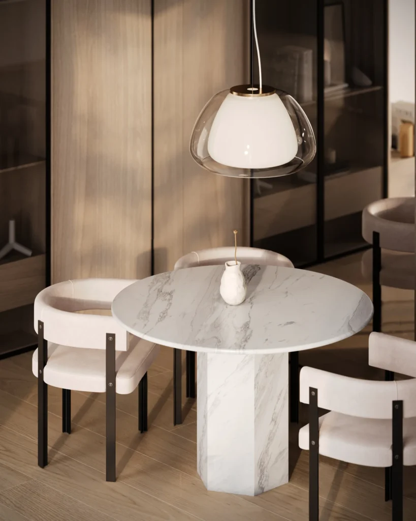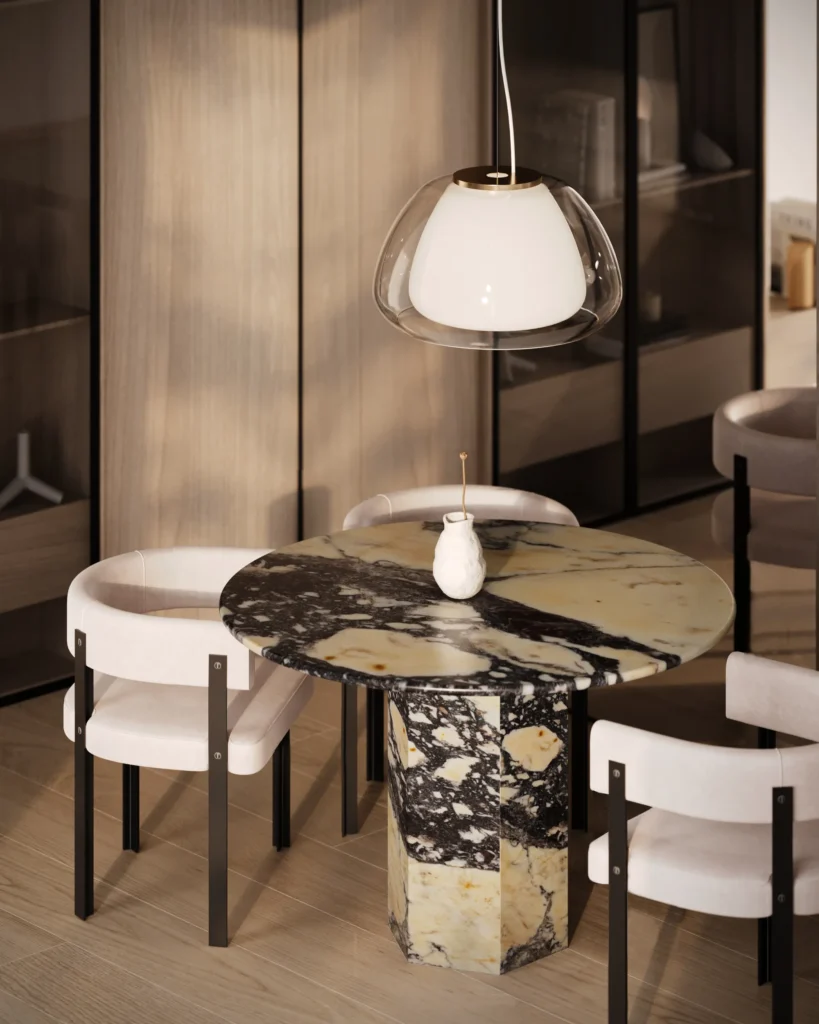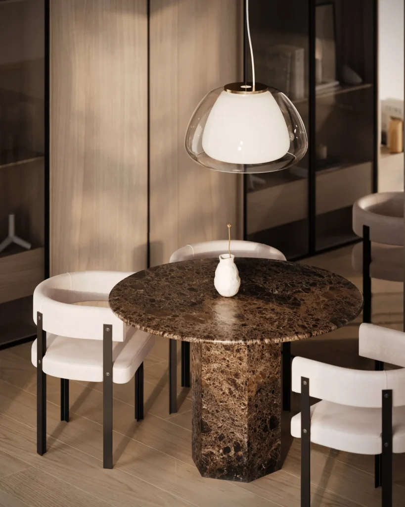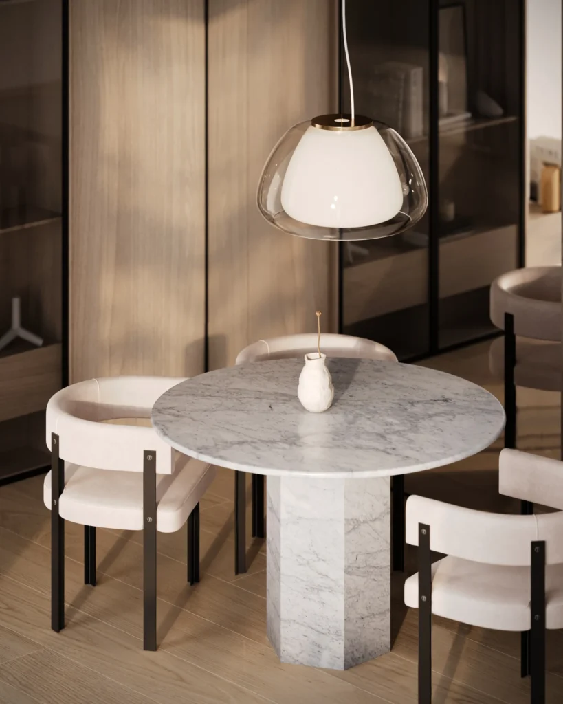 Trpezarijski sto Fortia ističe se jednostavnošću i bezvremenskom elegancijom. Njegova centralno postavljena baza od mermera pruža stabilnost i čvrstinu, dok ravna, blago zaobljena ploča dodaje dozu suptilne sofisticiranosti. Prirodni šari mermera unose jedinstvenu dinamiku u dizajn, čineći svaki komad unikatnim. Zahvaljujući savršenom spoju minimalizma i luksuza, Fortia je idealan izbor za moderne trpezarije koje teže jednostavnosti, funkcionalnosti i estetici.