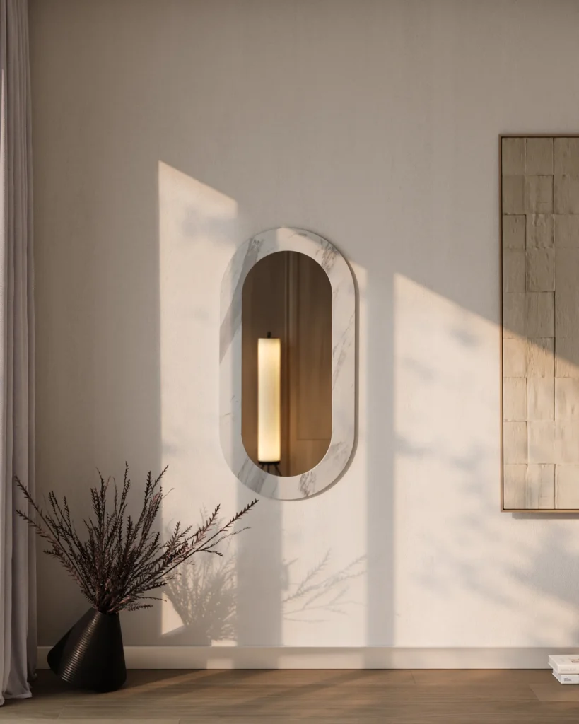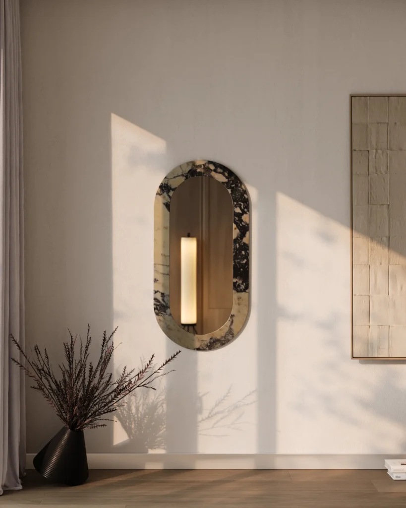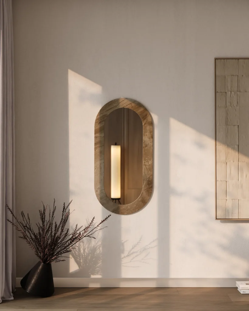 Ogledalo sa ramom od mermera predstavlja savršen spoj funkcionalnosti i luksuznog dizajna. Ovaj model omogućava potpunu personalizaciju, jer se ram može izrađivati od mermera po želji klijenta, čime se postiže jedinstven vizuelni efekat koji se uklapa u svaki prostor. Elegantan i minimalistički oblik ogledala, sa zaobljenim ivicama, čini ga savršenim detaljem za moderne enterijere, dodajući im sofisticiranost i prirodnu lepotu mermera. Ova inovativna ogledala pružaju i estetsku i funkcionalnu vrednost, idealna za bilo koji prostor.