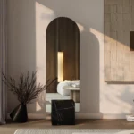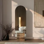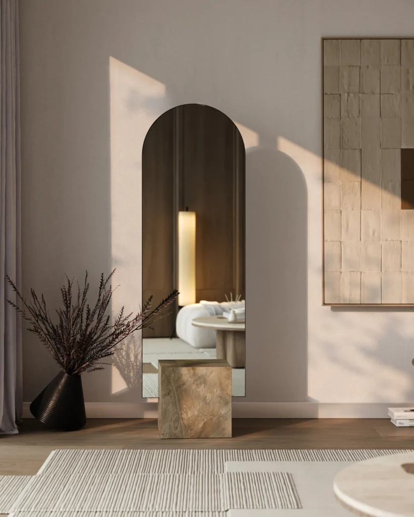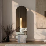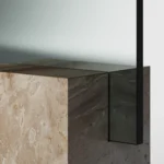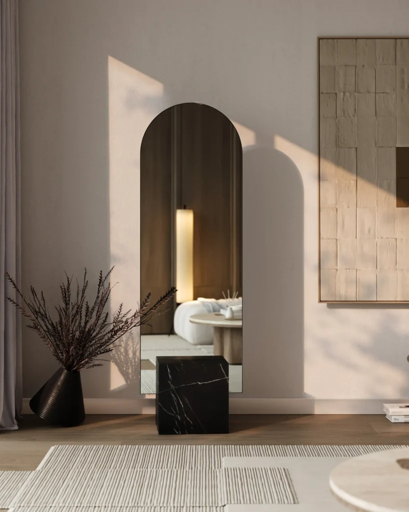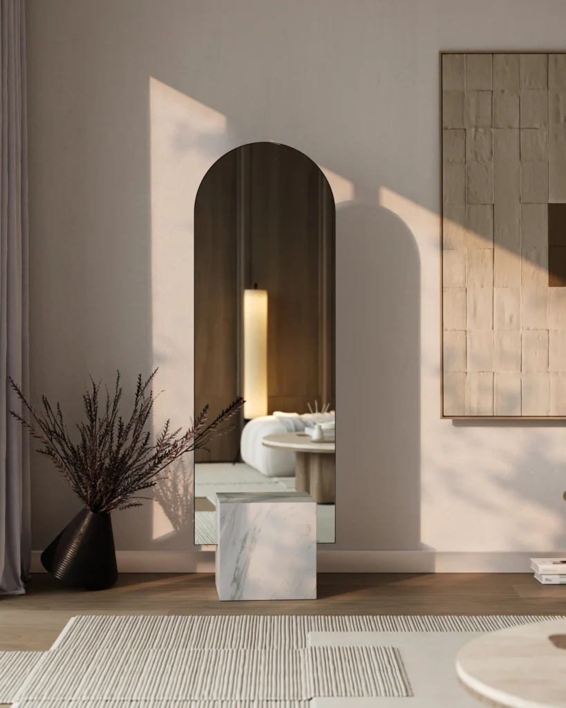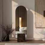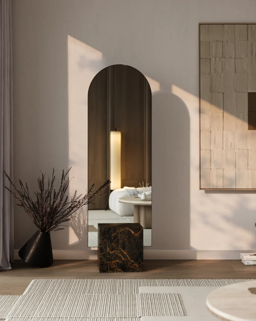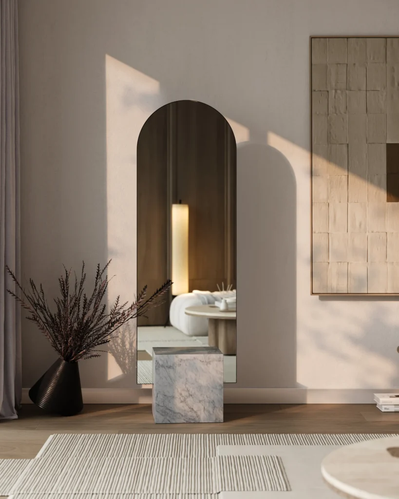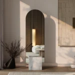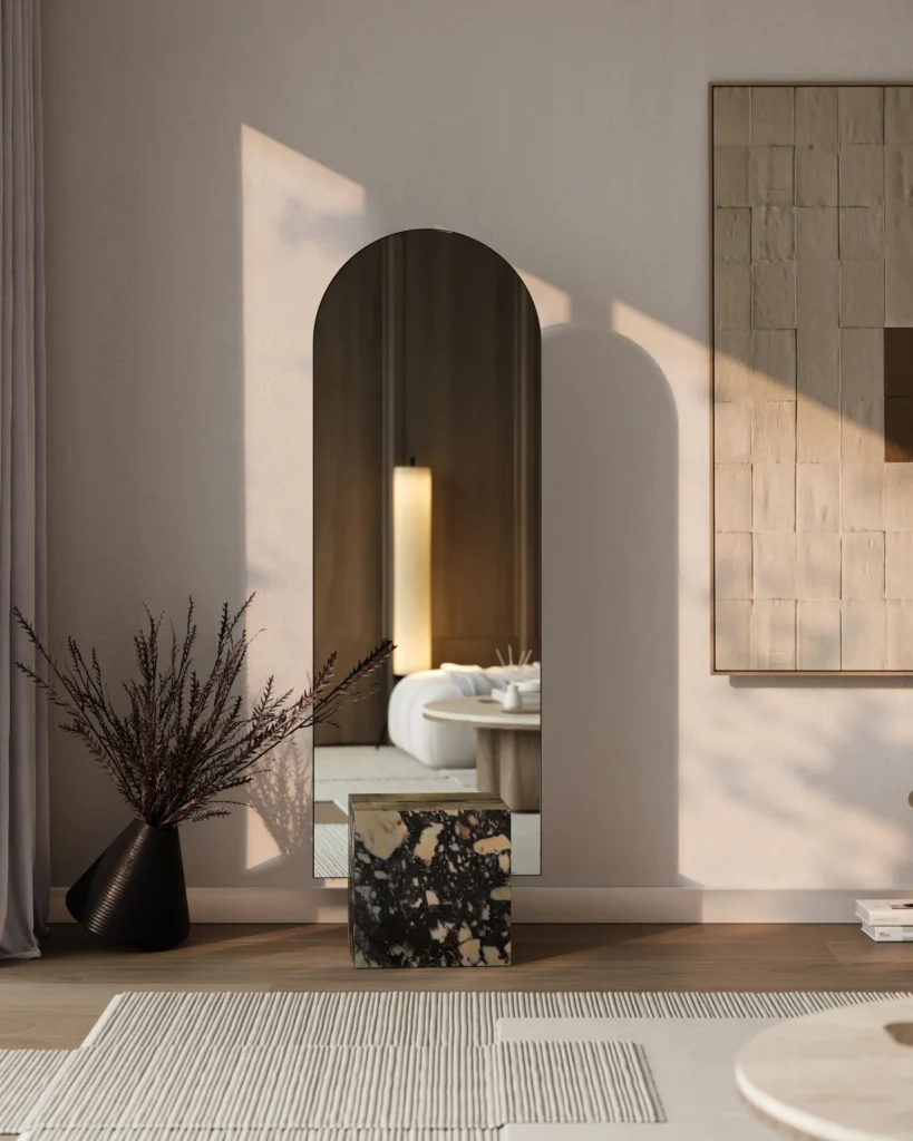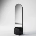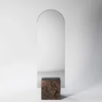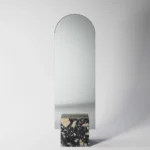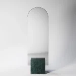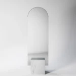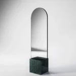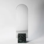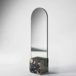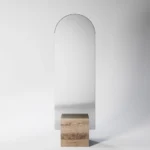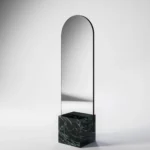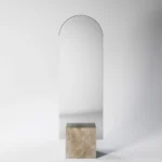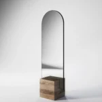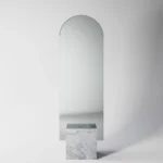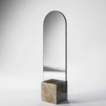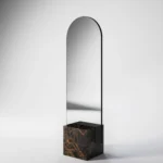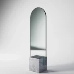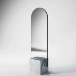 Ovo inovativno ogledalo sa postoljem od mermera donosi elegantan i sofisticiran dizajn sa zaobljenim ivicama ogledala. Kombinacija modernog oblika i prirodne lepote mermera čini ovaj model izuzetnim detaljem za svaki prostor. Kao i prethodni model, postolje ogledala može biti izrađeno od mermera po želji klijenta, čime se omogućava potpuna personalizacija. Ovaj dizajn donosi stabilnost i savršen vizuelni balans, unoseći u prostor luksuznu jednostavnost i sofisticiranost.